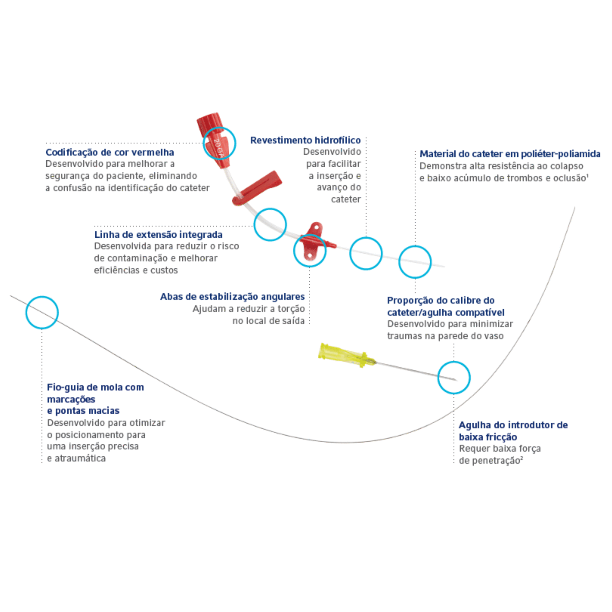 - Reforço na junção do cateter com o corpo central para evitar dobras.